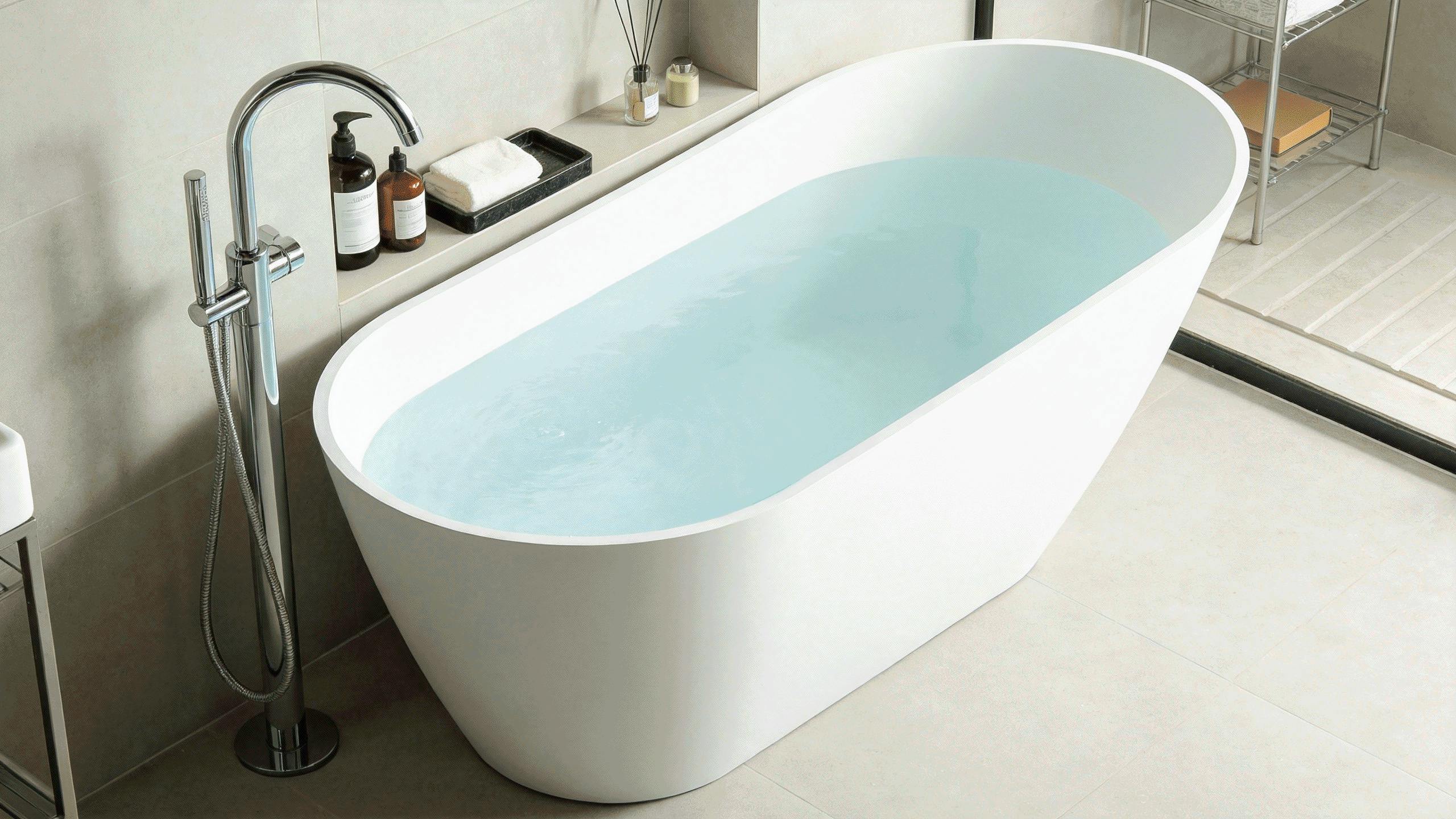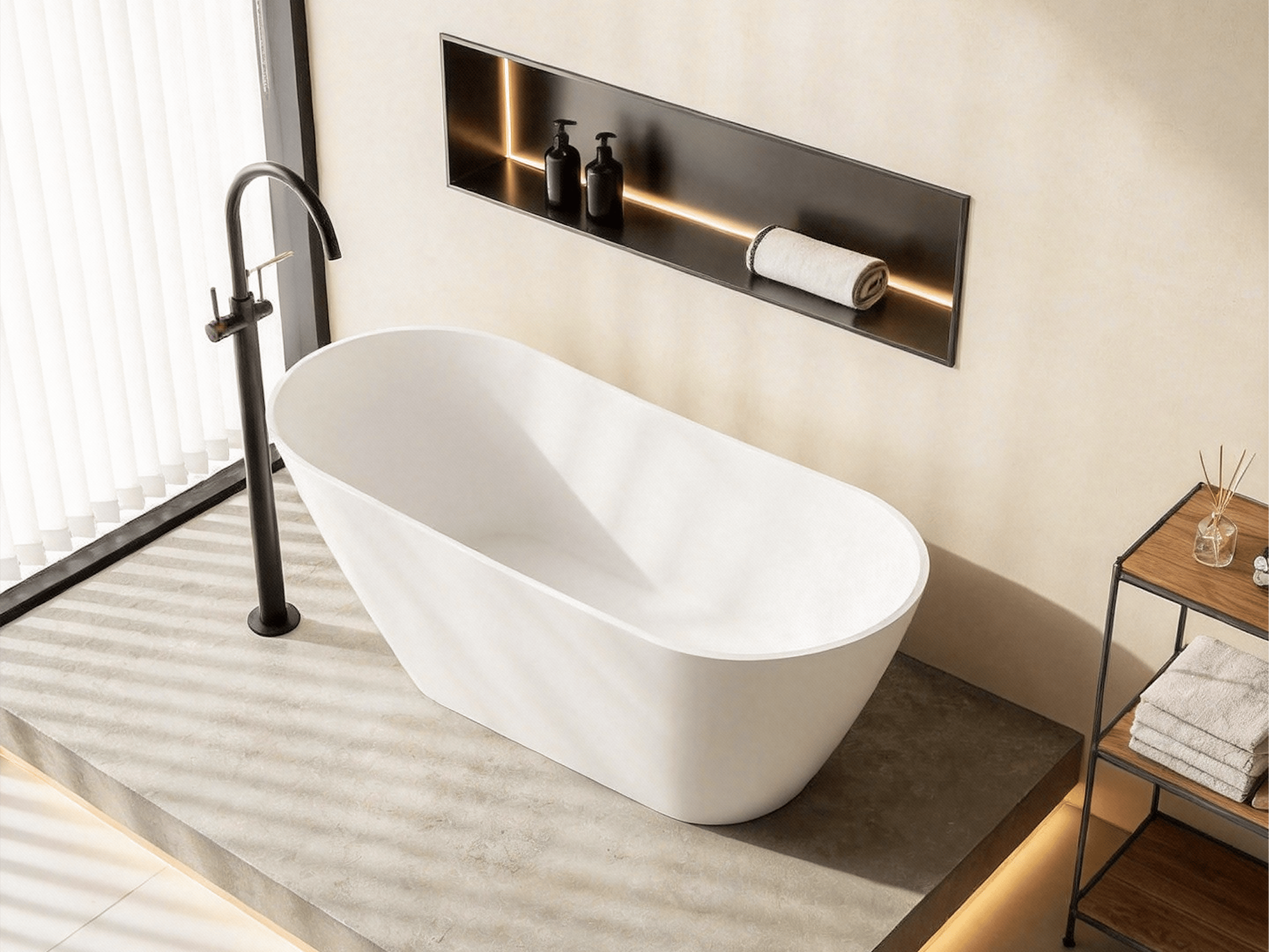 Eine Standardaufstellung für freistehende Wannen erfordert in der Regel einen Bodenablauf, der mit dem Ablaufanschluss der Wanne ausgerichtet ist. Nutzen Sie das Größenbild, um Platzierung und Freiraum zu bestätigen. Bei nicht standardmäßigen Vorinstallationsmaßen kann ein Klempner die Verlegung schnell vor dem Kauf prüfen.